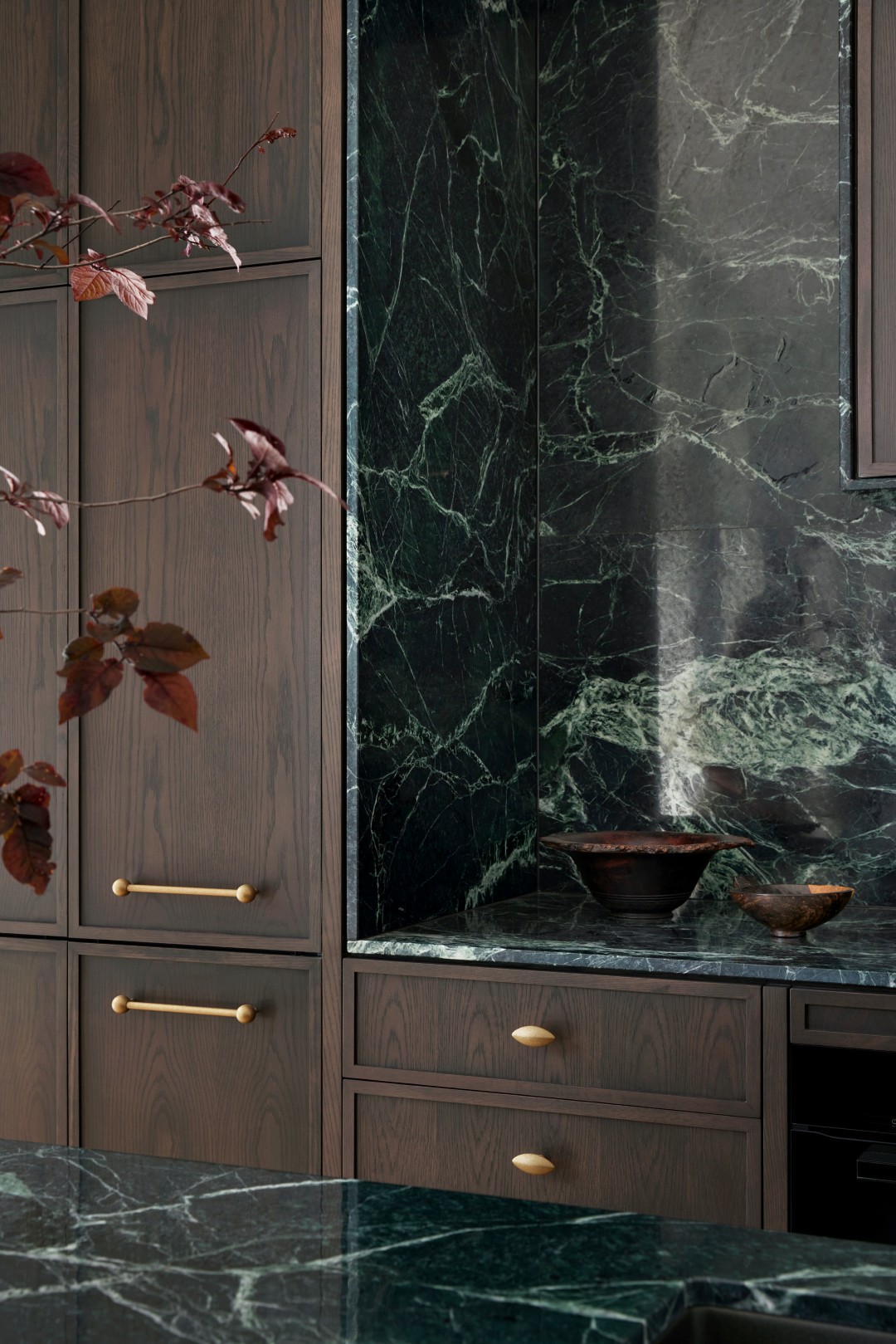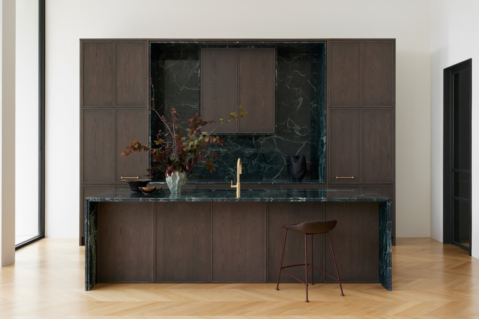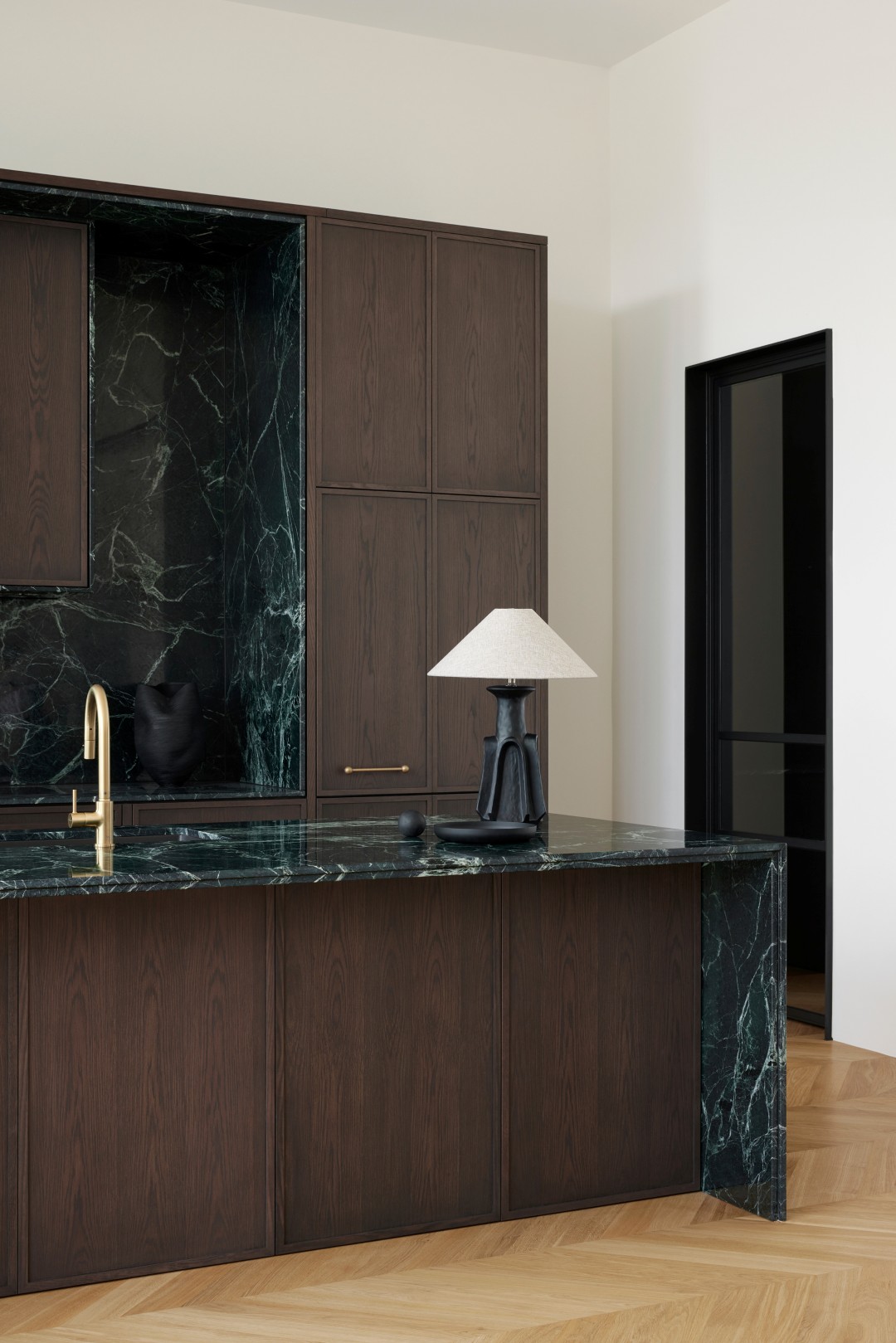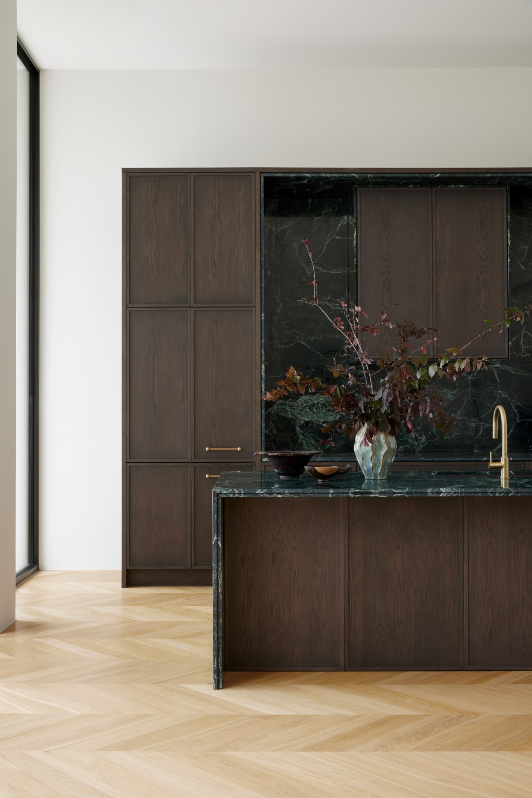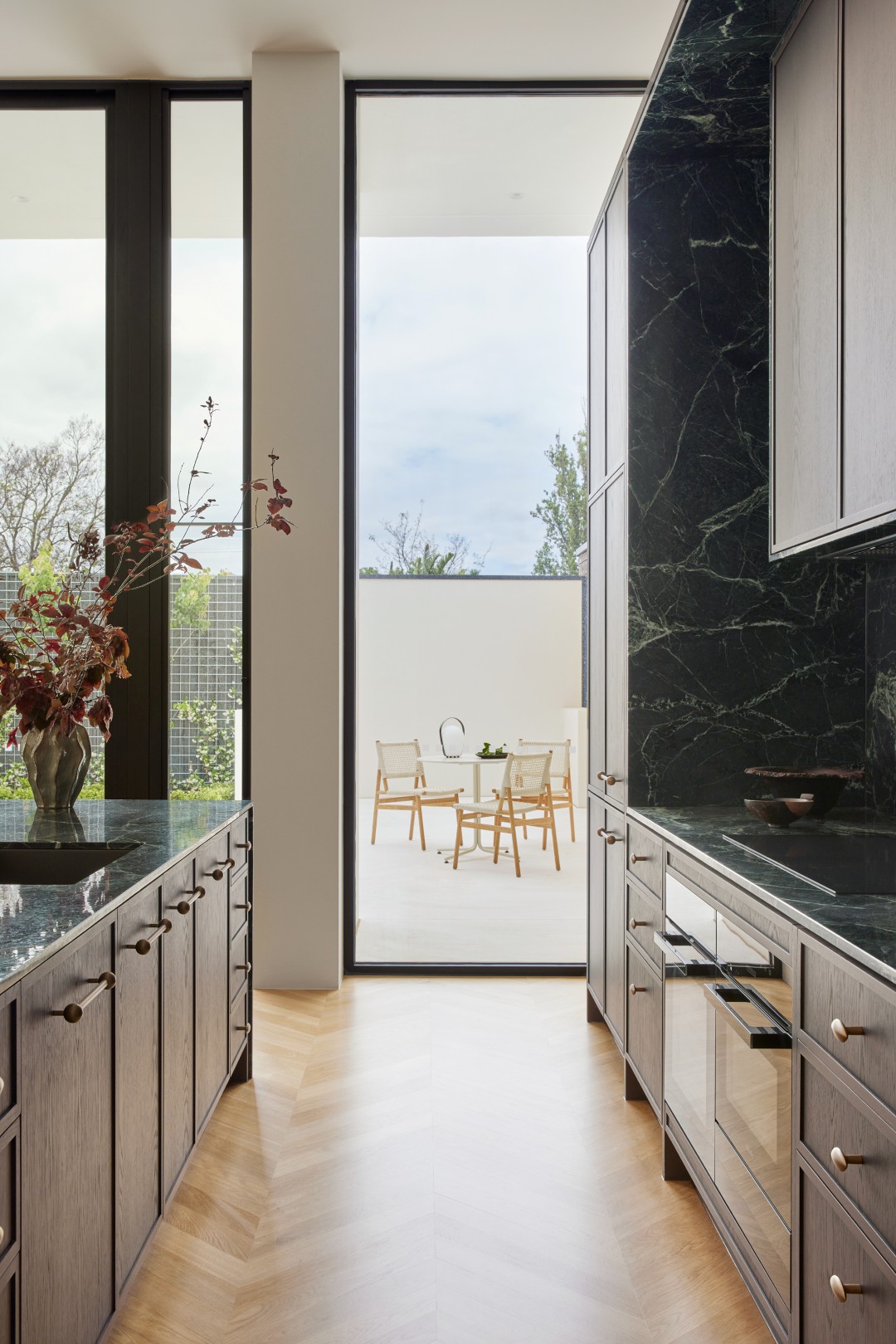 Material selections remain controlled and cohesive, from deep stained oak and Scalea Green stone to refined limestone and 2pac joinery. Solar, battery storage and home automation are integrated quietly into the home’s fabric.